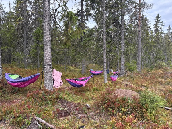 Vi trives godt ute, og tilbringer derfor mye tid ute i barnehage og på tur. I skogen skapes det mange fine opplevelser. Vi møtes rundt ei maurtue, i blåbærlyngen, ser dyreliv på nært hold, som ei marihøne på hånda eller hestene som bor i nærheten av barnehagen. Lydene ute er kjente for barna og gir trygghet. Omgivelsene ute gir mange muligheter til å bruke kroppen. Barna får mestringsopplevelser alene eller sammen med andre ved å utforske. Sammen gjør vi oppdagelser som gjør at vi blir kjent med naturen og blir glad i den. Formiddagsluren foregår mer enn gjerne i en hengekøye :)